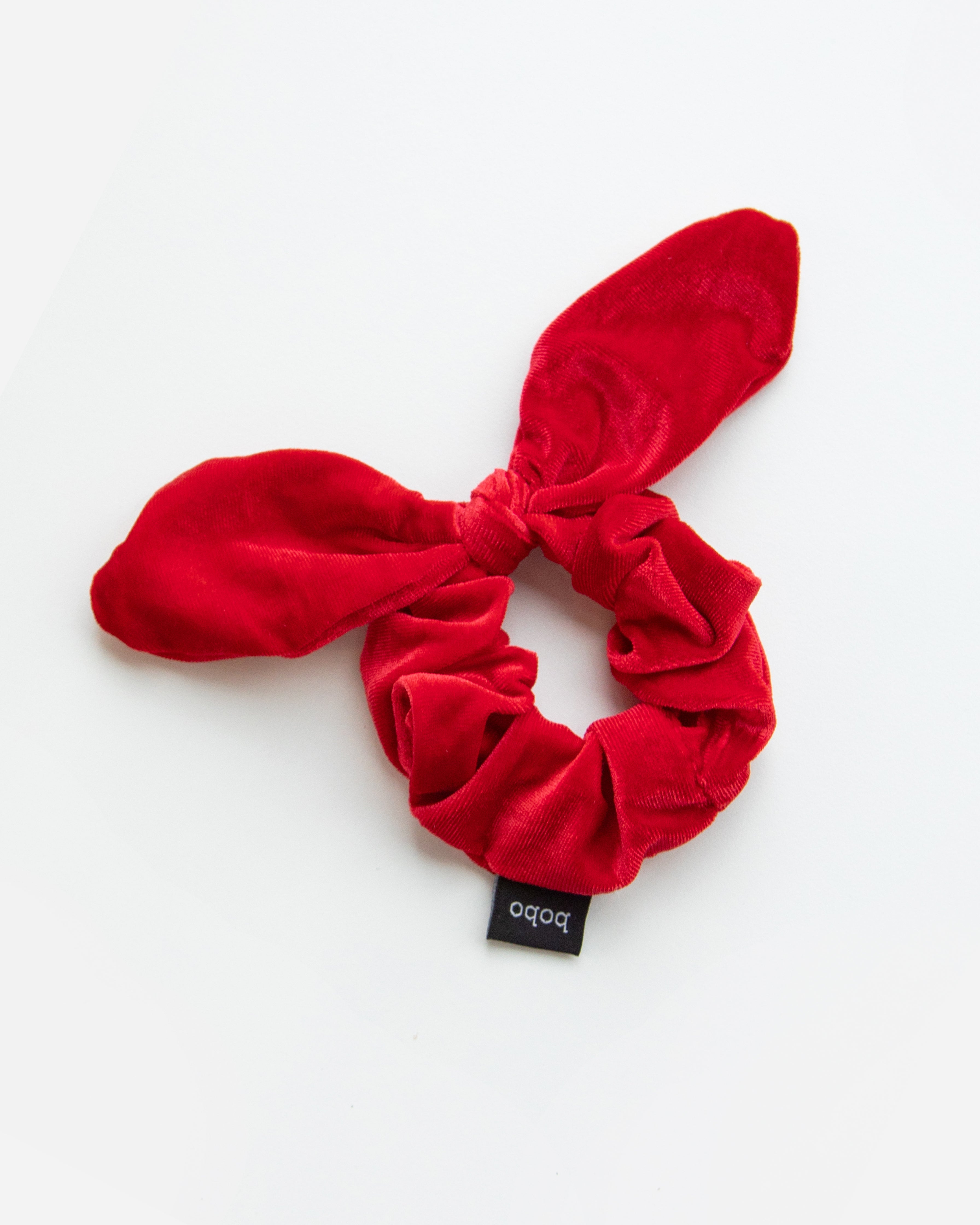 Elasticized scrunchie in premium silk velvet. Extra-gentle on hair, as luxuriously soft material minimizes friction and damage to hair. Flat elastic for no pull, with a signature removable bow.