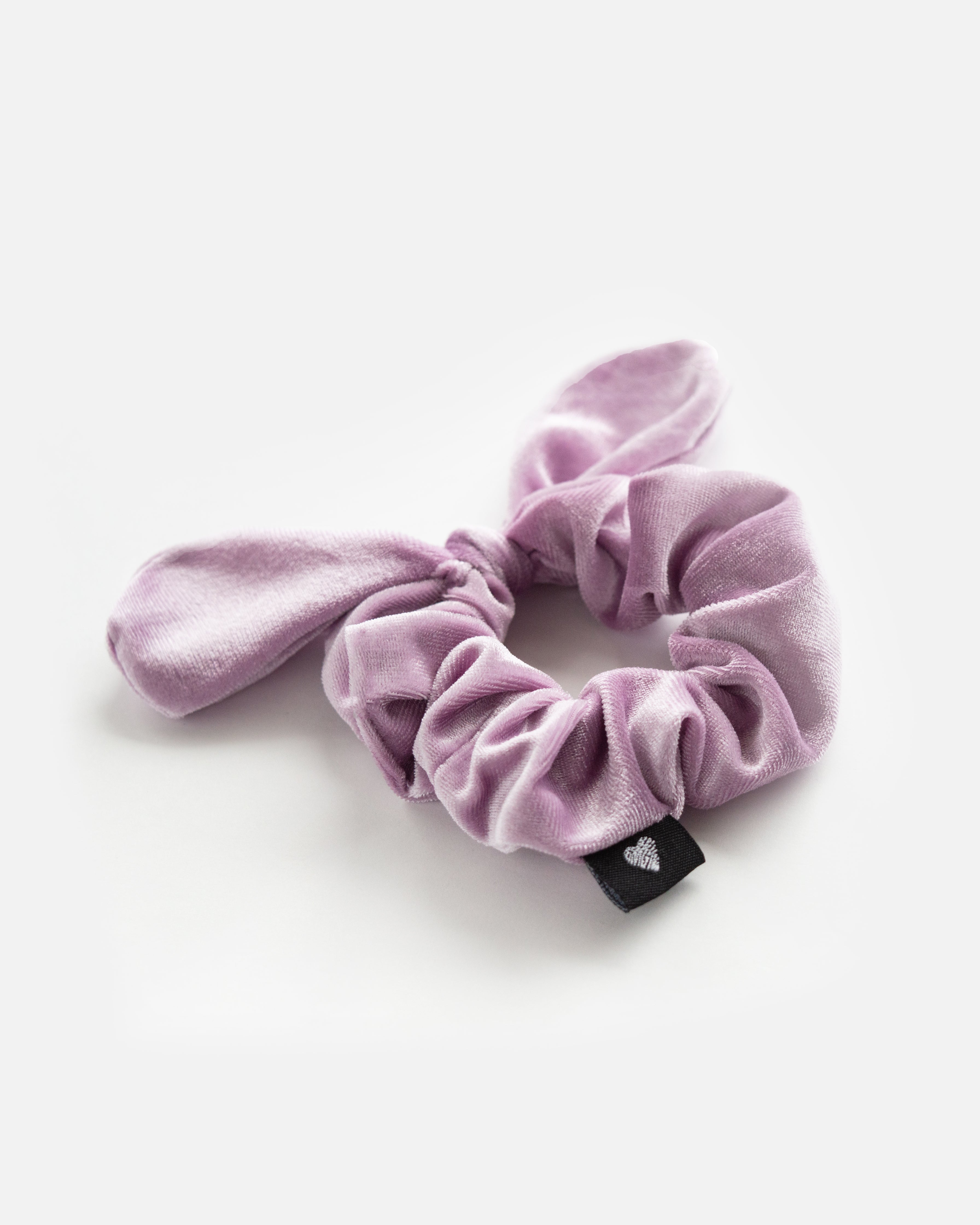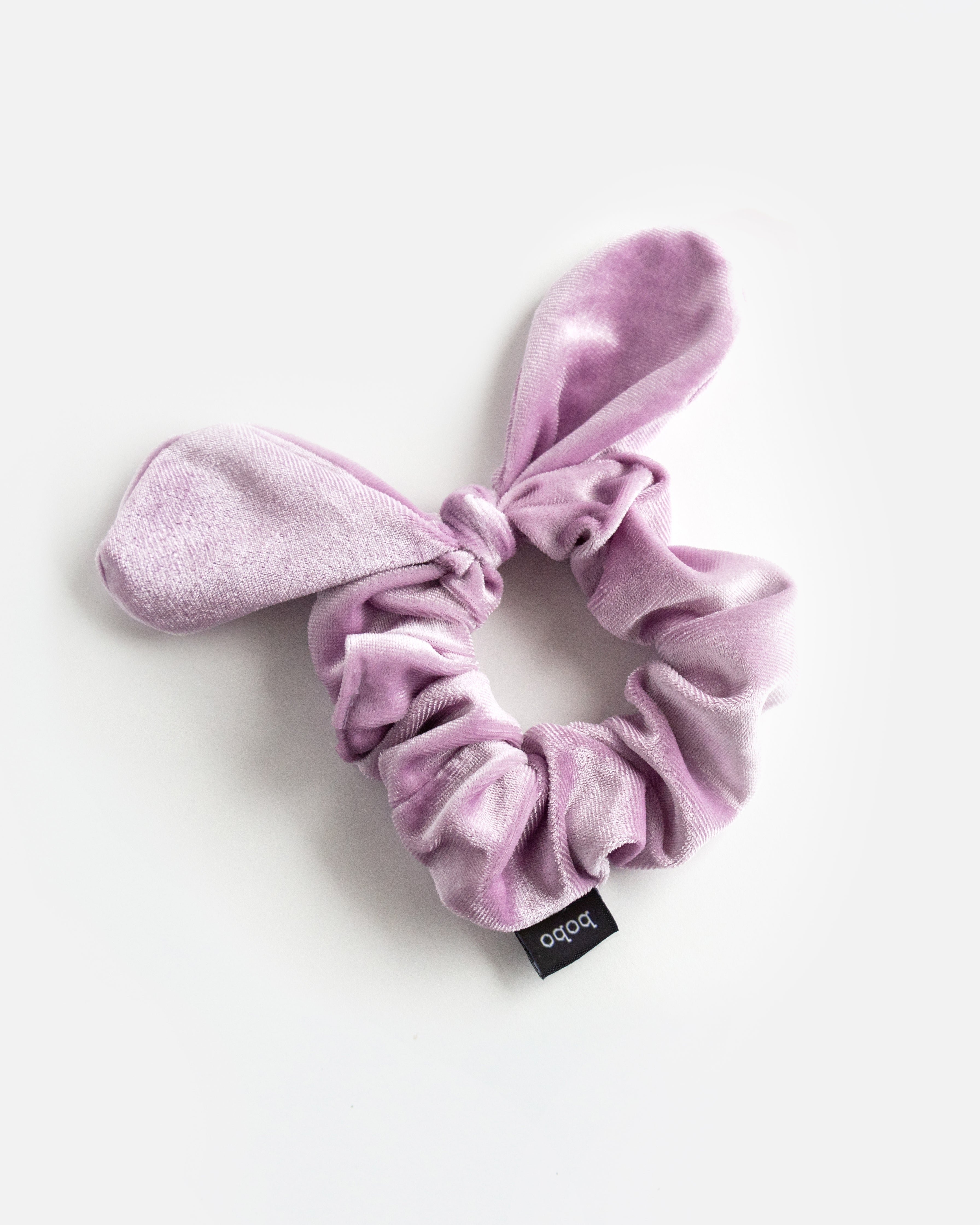 Elasticized scrunchie in premium silk velvet. Extra-gentle on hair, as luxuriously soft material minimizes friction and damage to hair. Flat elastic for no pull, with a signature removable bow.