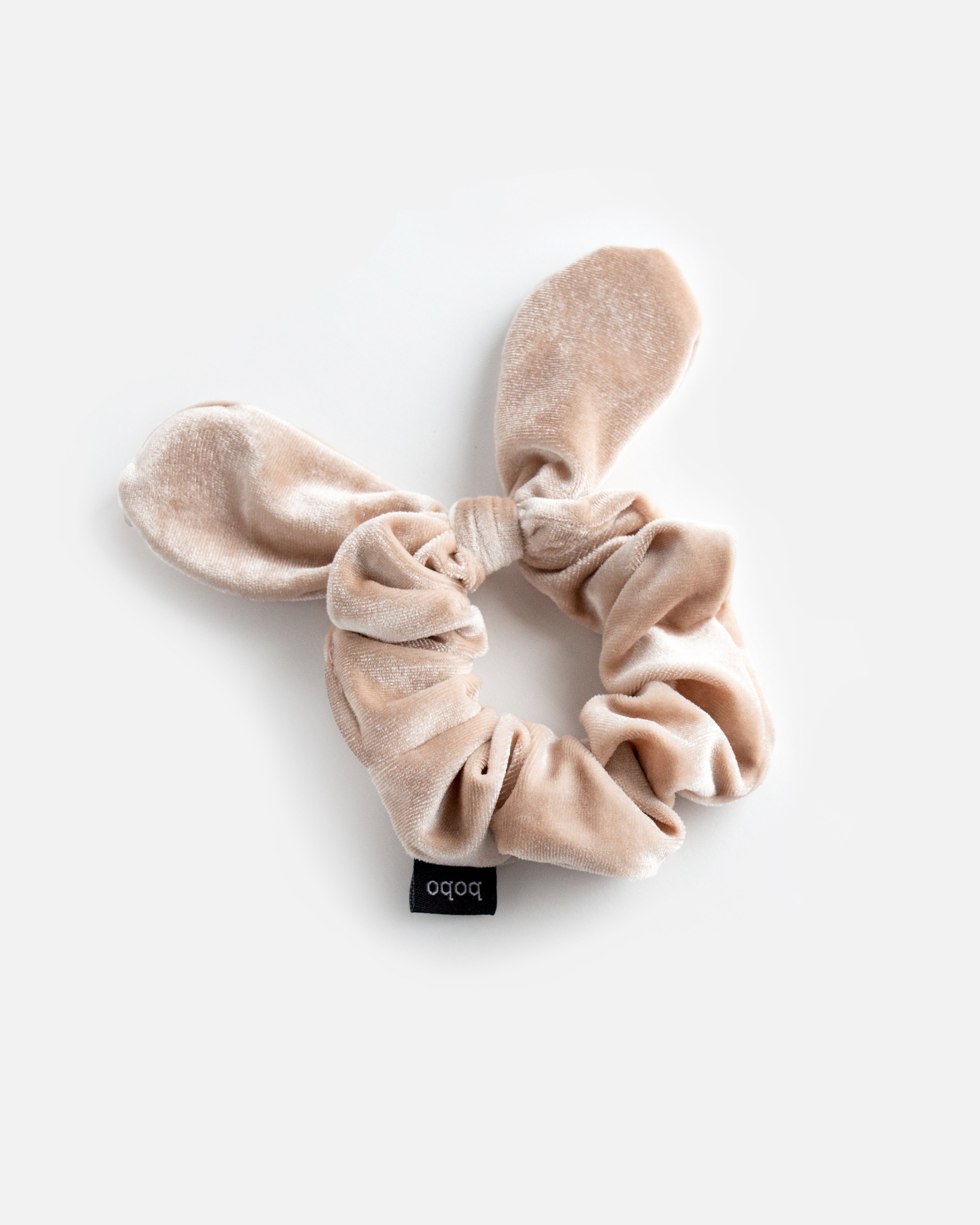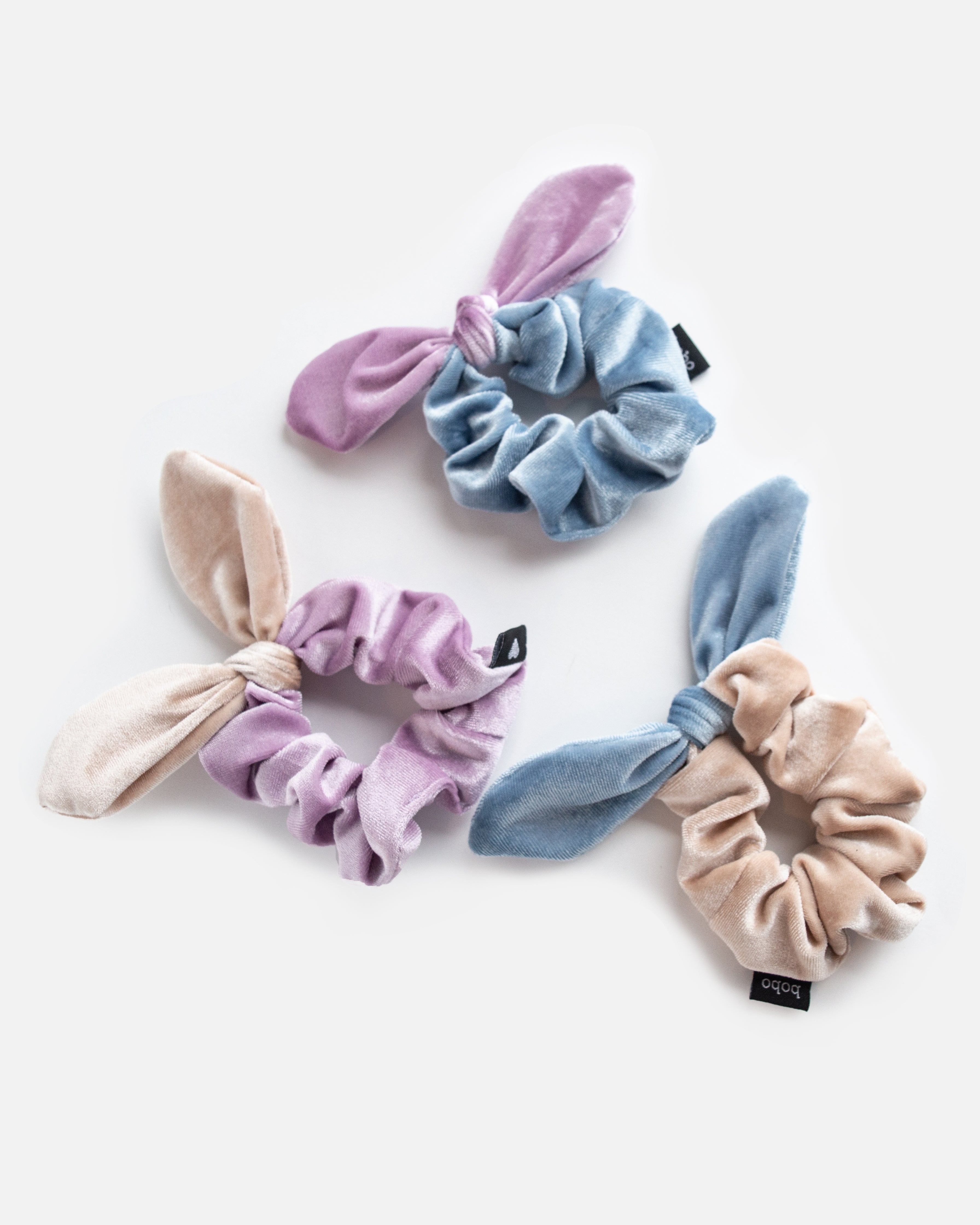 Elasticized scrunchies in premium silk velvet. Extra-gentle on hair, as luxuriously soft material minimizes friction and damage to hair. Flat elastic for no pull, with a signature removable bow.